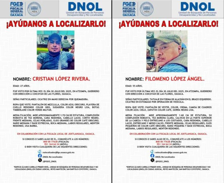 Ex síndico de Coicoyán de las Flores y su hijo, a unas horas de cumplir una semana desaparecidos; fichas de búsqueda continúan activas, reportan autoridades Autoridades de aquel municipio ubicado en la región de la Mixteca, en los límites con Guerrero, reportaron que hasta este… 6 agosto, 2025