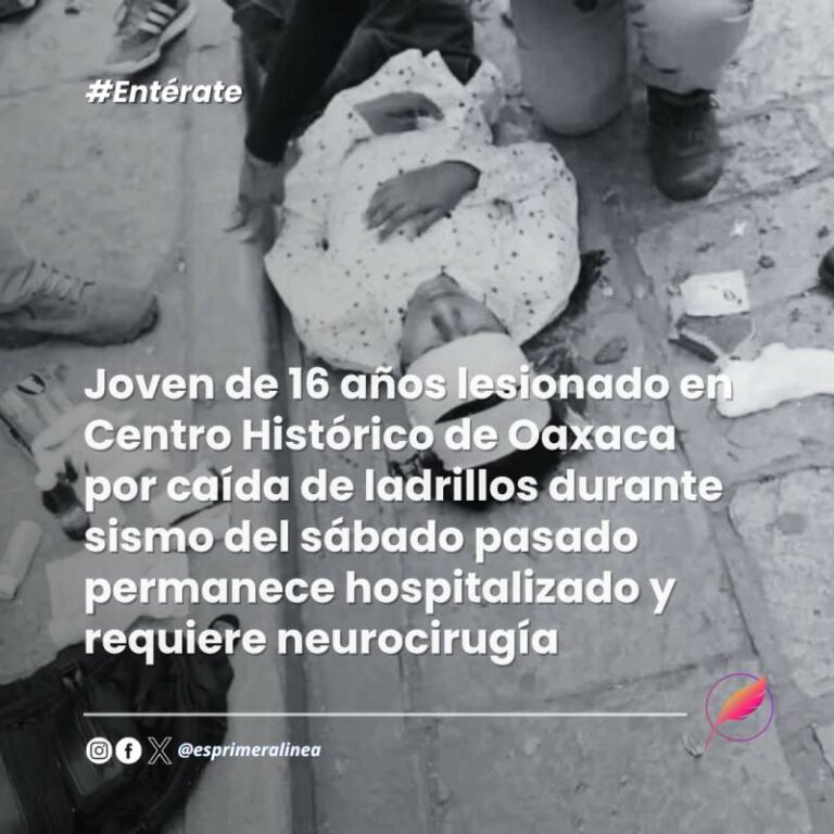 Joven de 16 años lesionado en Centro Histórico de Oaxaca por caída de ladrillos durante sismo del sábado pasado permanece hospitalizado y requiere neurocirugía El joven de 16 años, Isaac L.H., requiere de una intervención quirúrgica para contrarrestar un hematoma epidural frontoparietal, que sufrió… 4 agosto, 2025