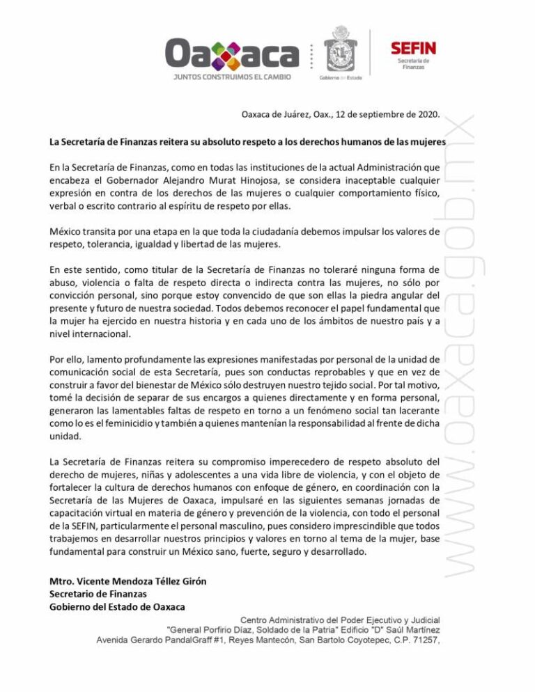 Despide SEFIN a vocero que ironizó feminicidios El titular de la Secretaría de Finanzas, Vicente Mendoza Téllez Girón despidió a Iván Flores Noriega, quien se desempeñaba como… 12 septiembre, 2020