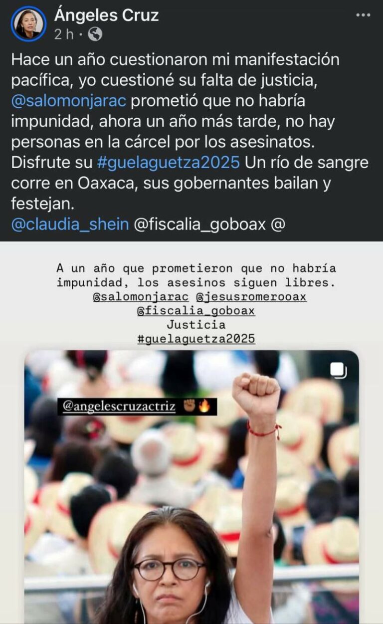 A un año de protestar durante la Guelaguetza, la cineasta Ángeles Cruz denuncia impunidad y violencia “Hace un año cuestionaron mi manifestación pacífica, yo cuestioné su falta de justicia. Salomón Jara prometió que no habría impunidad.… 21 julio, 2025