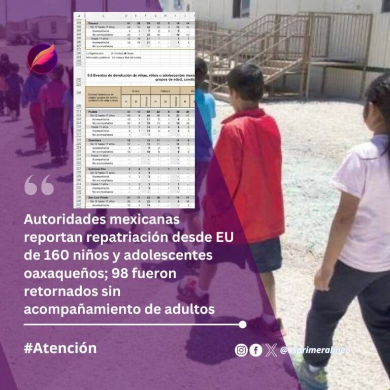 Autoridades mexicanas reportan repatriación desde EU de 160 niños y adolescentes oaxaqueños; 98 fueron retornados sin acompañamiento de adultos Se trata de 97 adolescentes de 12 a 17 años que fueron retornados a México entre enero y mayo pasado… 15 julio, 2025