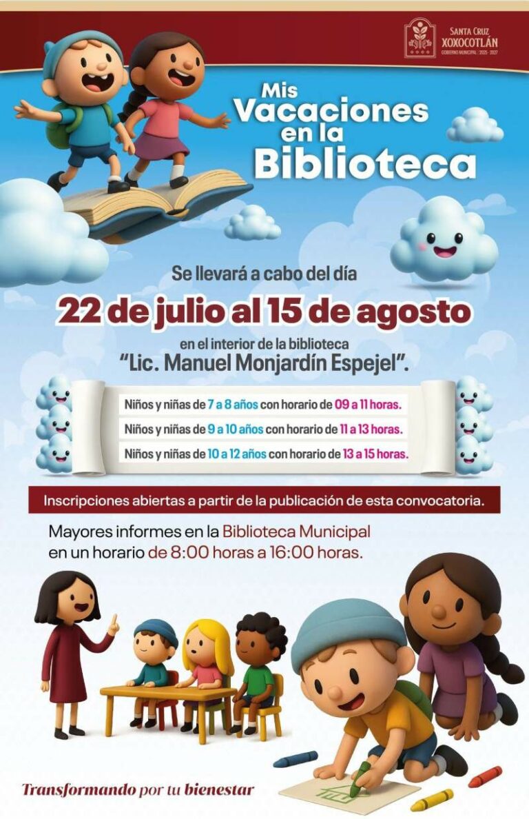 Verano con libros y diversión: Xoxocotlán invita a vivir ´Mis Vacaciones en la Biblioteca’ Del 22 de julio al 15 de agosto, la niñez xoxeña podrá disfrutar de talleres, cursos y actividades lúdicas 15 julio, 2025