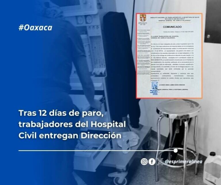 Tras 12 días de paro, trabajadores del Hospital Civil entregan Dirección De acuerdo con organización de trabajadores, la entrega de las instalaciones fue efectuada este 19 de mayo a las representaciones… 20 mayo, 2025