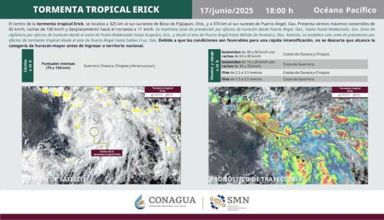 Se degrada Huracán Erick a categoría 1 y continúa generando lluvias intensas en Oaxaca Estas precipitaciones pueden estar acompañadas de descargas eléctricas, ocasionar inundaciones en zonas urbanas y bajas, aumentar los niveles de ríos… 19 junio, 2025