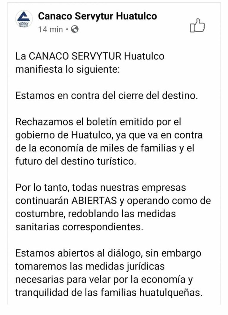 Reta sector empresarial a autoridades de Huatulco no cerrarán comercios Disponen ediles de la Costa cierre de playas y de comercios 9 agosto, 2021
