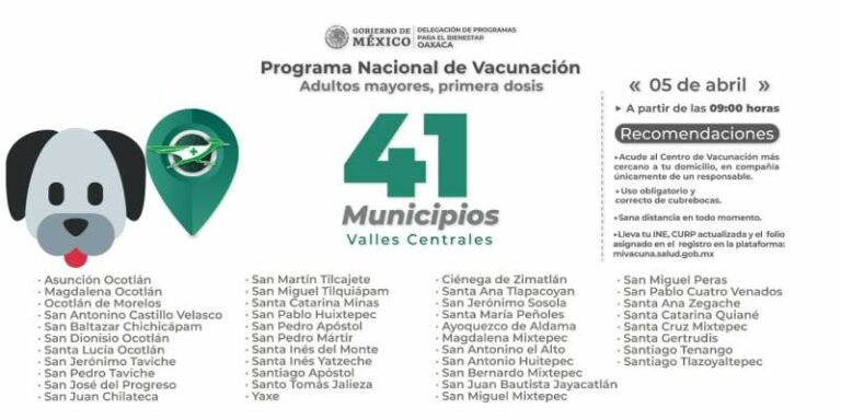 Arranca jornada de vacunación anticovid en 41 municipios del Valle Central La jornada de vacunación anticovid para adultos mayores arrancó en 41 municipios del Valle Central de Oaxaca, de acuerdo al… 5 abril, 2021
