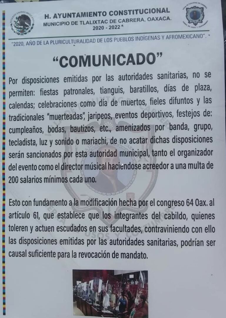 Imponen multas en Tlalixtac de Cabrera para cumplir medidas sanitarias En Oaxaca de Juárez se permiten festejos en plena pandemia 24 octubre, 2020