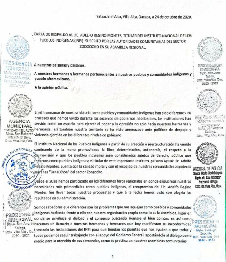 Respalda Sector Zoogocho a titular del INPI; apuestan al diálogo para solucionar conflictos con pueblos indígenas Al menos 14 comunidades de la Sierra Norte de Oaxaca y que conforman el sector Zoogocho respaldaron al titular del… 25 octubre, 2020