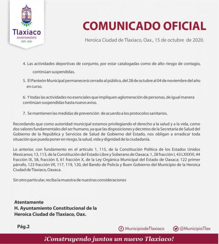 Se deslinda autoridad de Tlaxiaco de festividades; no hay permisos, señala Autoridades municipales de la Heroica Ciudad de Tlaxiaco aseguraron que no han concedido permisos para la realización de eventos masivos 19 octubre, 2020