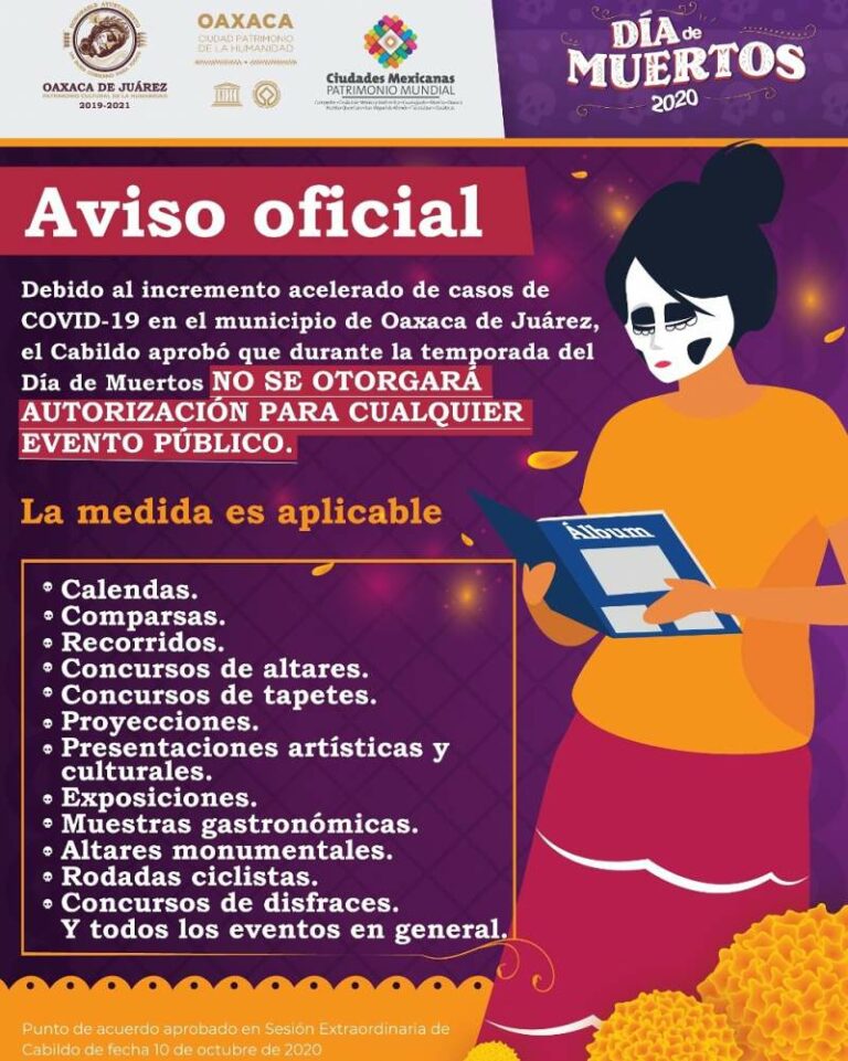 Suspenden celebraciones de Día de Muertos en municipio de Oaxaca Comparsas, calendas, muestras gastronómicas, exposiciones, visitas a panteones y otros eventos alusivos al Día de Muertos, fueron cancelados por el… 17 octubre, 2020