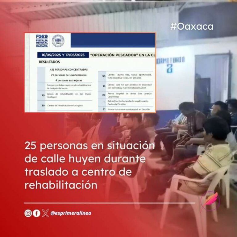 25 personas en situación de calle huyen durante traslado a centro de rehabilitación en Oaxaca Al menos 25 personas indigentes y con problemas de adicción a sustancias, que habían sido aseguradas durante el operativo Pescador 19 mayo, 2025