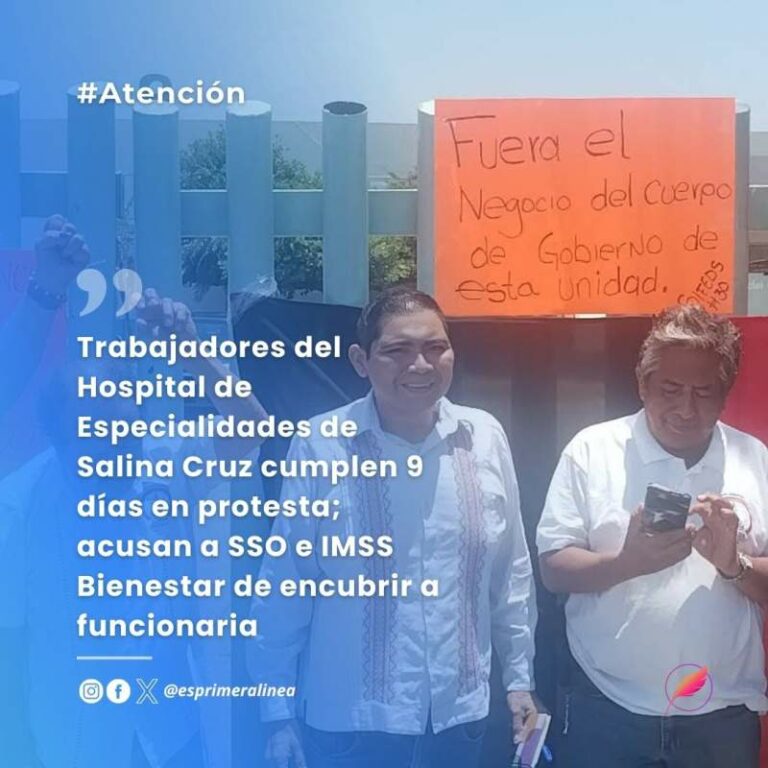 Trabajadores del Hospital de Especialidades de Salina Cruz cumplen 9 días en protesta; acusan a SSO e IMSS Bienestar de encubrir a funcionaria Trabajadores del Hospital de Especialidades de Salina Cruz cumplen 9 días en protesta; acusan a SSO e IMSS Bienestar de… 16 mayo, 2025