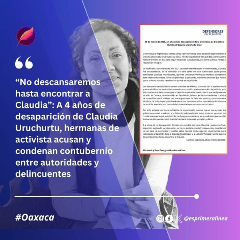 “No descansaremos hasta encontrar a Claudia”: A 4 años de desaparición de Claudia Uruchurtu, hermanas de activista acusan y condenan contubernio entre autoridades y delincuentes “No descansaremos hasta encontrar a Claudia”: A 4 años de desaparición de Claudia Uruchurtu, hermanas de activista acusan y condenan… 26 marzo, 2025