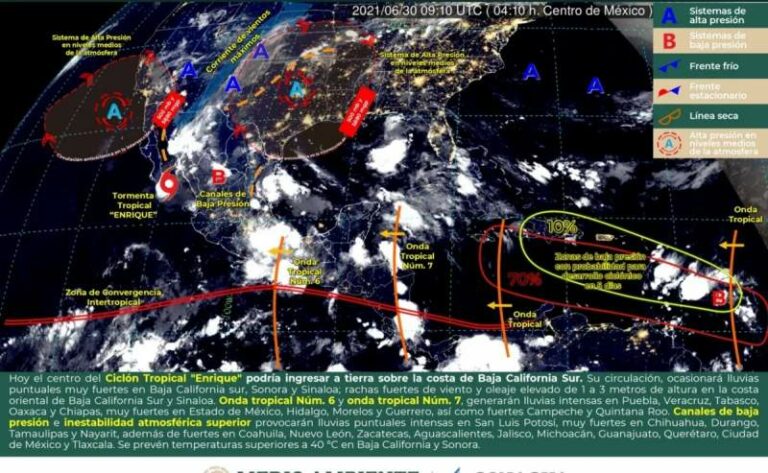 Pronóstico del clima de hoy: onda tropical 6 y7 traerán lluvias en varios estados de México Para hoy, el ciclón tropical "Enrique" que se localizará al sureste de Baja California Sur, inestabilidad atmosférica superior 30 junio, 2021