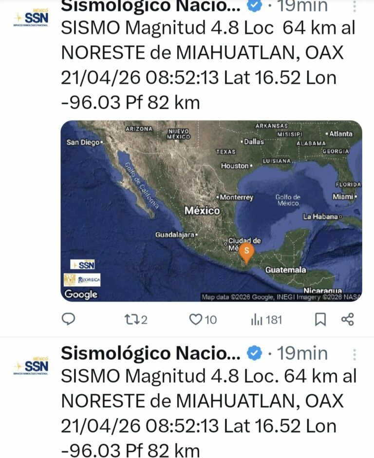 Con un segundo de diferencia, reportan en Oaxaca dos sismos esta mañana: uno de 5.2 grados en Valles Centrales y otro de 4.8 en la Sierra Sur; no hay afectaciones hasta el momento Oaxaca, Oaxaca.- Con un segundo de diferencia, dos sismos de magnitudes preliminares de 5.2 grados, con epicentro en Valles Centrales,… 21 abril, 2026