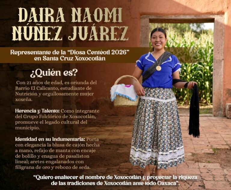 Daira Naomi representará a Xoxocotlán en la Diosa Centéotl 2026 Daira Naomi Núñez Juárez, de 21 años y originaria del Barrio El Calicanto, ha sido seleccionada como la representante oficial… 20 abril, 2026
