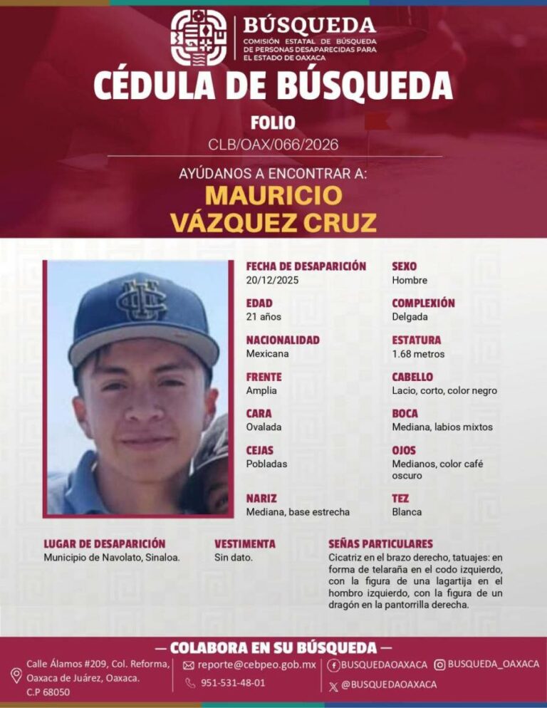 Meses de impunidad e injusticia: autoridades no han hecho ningún operativo de búsqueda para dar con oaxaqueño Mauricio Vásquez, desaparecido en Sinaloa hace 4 meses Mauricio Vásquez Cruz, un joven oaxaqueño de 21 años, lleva cuatro meses desaparecido en Sinaloa tras desaparecer el 20 de… 20 abril, 2026