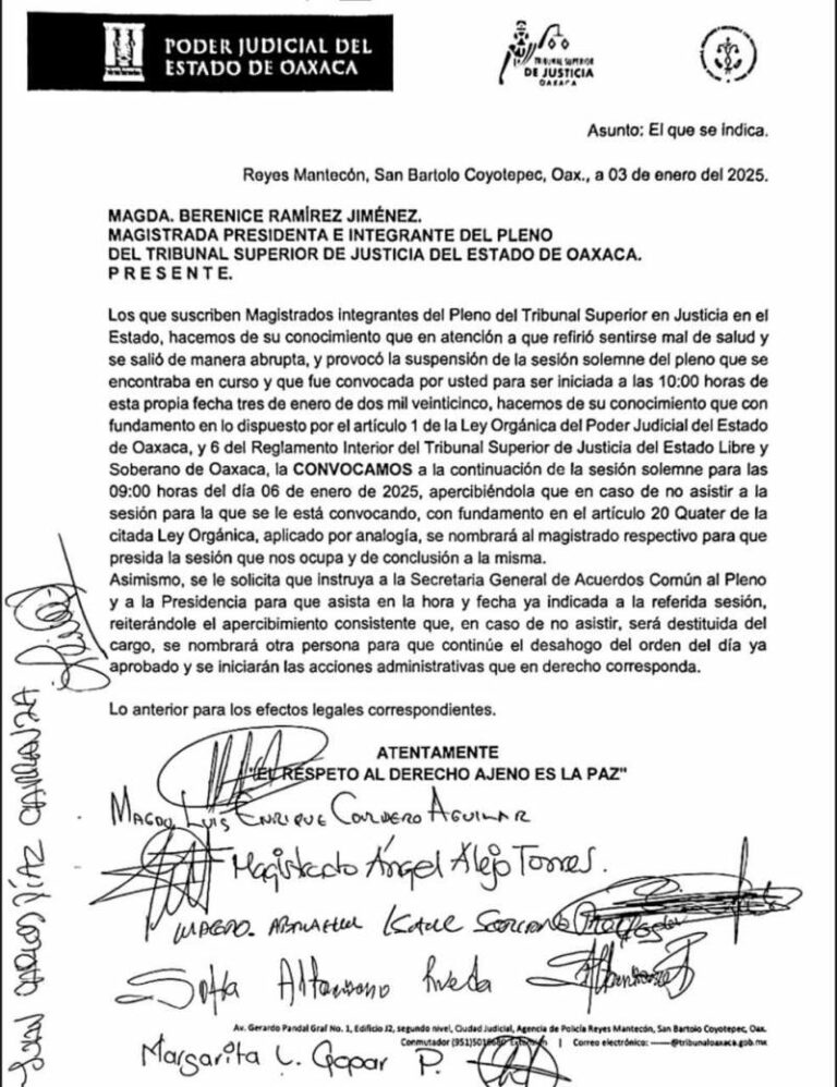 Magistrados convocan a la presidenta del TSJEO, Berenice Ramírez, a continuar con la sesión solemne del 3 de enero Los magistrados que integran el pleno del Tribunal Superior de Justicia del Estado de Oaxaca (TSJEO) convocaron 5 enero, 2025