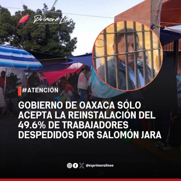Gobierno de Oaxaca sólo acepta la reinstalación del 49.6% de trabajadores despedidos por Salomón Jara Gobierno de Oaxaca sólo acepta la reinstalación del 49.6% de trabajadores despedidos por Salomón Jara 29 diciembre, 2024