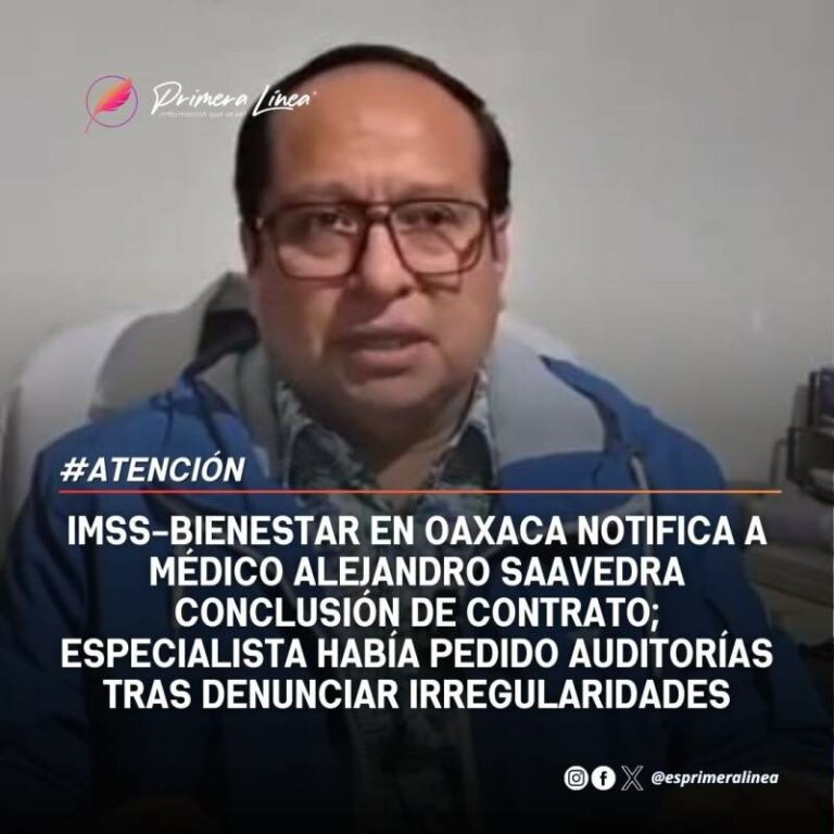 IMSS-Bienestar en Oaxaca notifica a médico Alejandro Saavedra conclusión de contrato; especialista había pedido auditorías tras denunciar irregularidades IMSS-Bienestar en Oaxaca notifica a médico Alejandro Saavedra conclusión de contrato; especialista había pedido auditorías tras denunciar irregularidades 28 diciembre, 2024