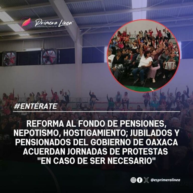 Reforma al fondo de pensiones, nepotismo, hostigamiento; jubilados y pensionados del Gobierno de Oaxaca acuerdan jornadas de protestas “en caso de ser necesario” La asamblea general de la Asociación de Jubilados, Pensionados y Pensionistas del Gobierno del Estado de Oaxaca acordó realizar una… 19 diciembre, 2024