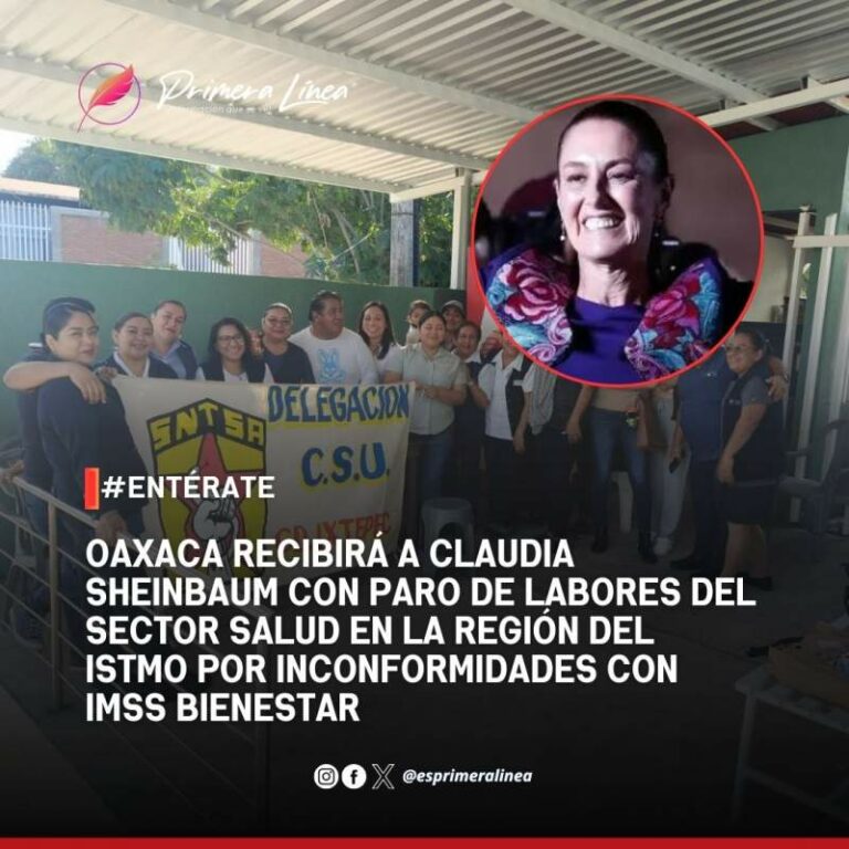 Oaxaca recibirá a Claudia Sheinbaum con paro de labores del sector salud en la región del Istmo por inconformidades con IMSS Bienestar La Subsección 02 de la Sección 35 del Sindicato Nacional de Trabajadores de la Secretaría de Salud (SNTSA) determinó esta… 6 diciembre, 2024
