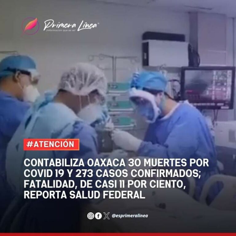 Contabiliza Oaxaca 30 muertes por COVID 19 y 273 casos confirmados; fatalidad, de casi 11 por ciento, reporta Salud federal Con 30 defunciones confirmadas, Oaxaca ocupa actualmente el sexto lugar nacional de muertes por COVID 19, informaron autoridades federales. 30 noviembre, 2024