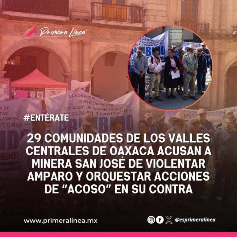 29 comunidades de los Valles Centrales de Oaxaca acusan a minera San José de violentar amparo y orquestar acciones de “acoso” en su contra Veintinueve comunidades de la región de Valles Centrales de Oaxaca demandaron por enésima vez la cancelación de la concesión otorgada… 13 noviembre, 2024