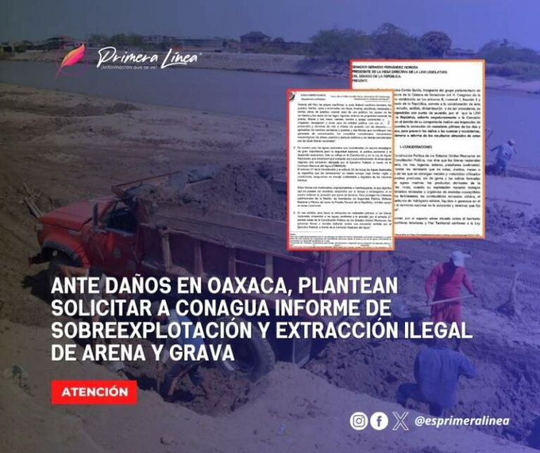 Ante daños en Oaxaca, plantean solicitar a Conagua informe de sobreexplotación y extracción ilegal de arena y grava Una proposición con punto de acuerdo presentada en el Senado de la República solicita a la Comisión Nacional del Agua… 9 noviembre, 2024