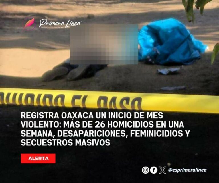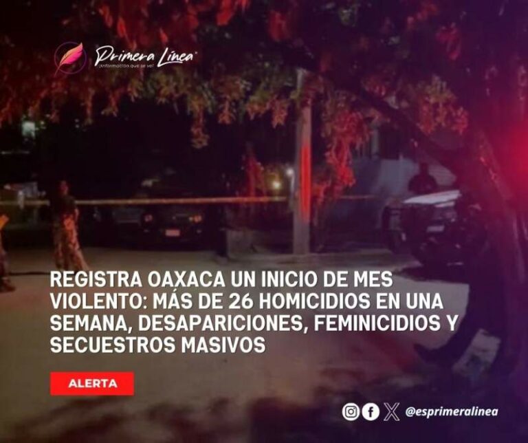 Registra Oaxaca un inicio de mes violento: más de 26 homicidios en una semana, desapariciones, feminicidios y secuestros masivos En los primeros siete días de noviembre, en Oaxaca se registraron al menos 26 homicidios dolosos en diferentes municipios de… 9 noviembre, 2024