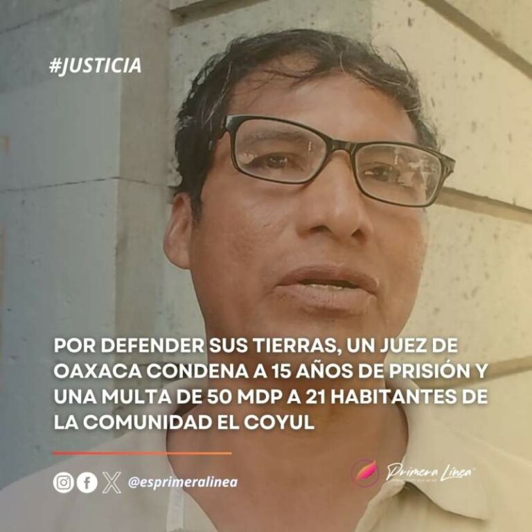 Por defender sus tierras, un juez de Oaxaca condena a 15 años de prisión y una multa de 50 mdp a 21 habitantes de la comunidad El Coyul Veintiún habitantes de El Coyul, comunidad del municipio de San Pedro Huamelula, fueron sentenciados por un juez de Oaxaca a… 10 noviembre, 2024