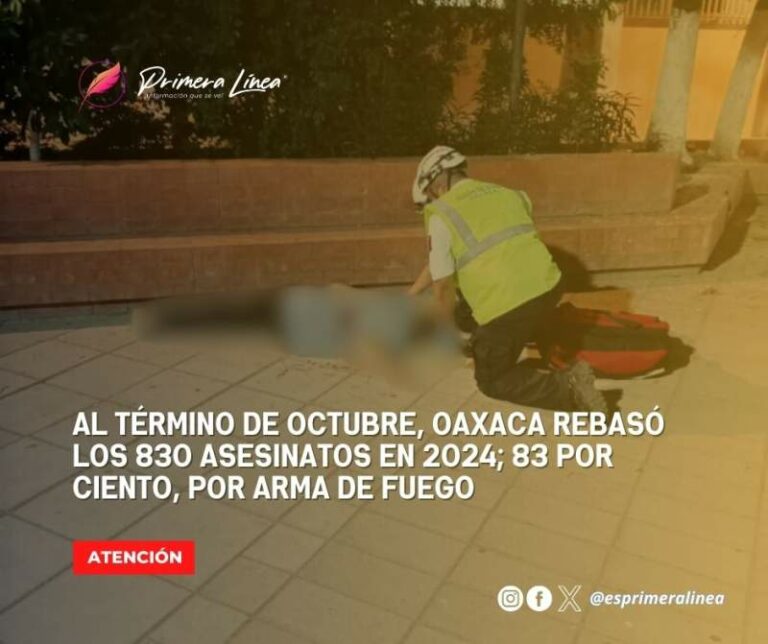 Al término de octubre, Oaxaca rebasó los 830 asesinatos en 2024; 83 por ciento, por arma de fuego Al término de octubre, Oaxaca rebasó la cifra de 836 personas asesinadas únicamente durante 2024 en hechos violentos documentados en… 6 noviembre, 2024