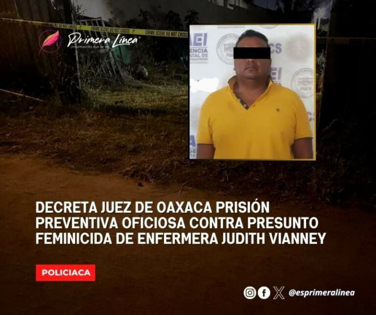 Decreta juez de Oaxaca prisión preventiva oficiosa contra presunto feminicida de enfermera Judith Vianney Un Juez de Control de los Valles Centrales de Oaxaca decretó ayer la medida de prisión preventiva oficiosa en contra… 6 noviembre, 2024