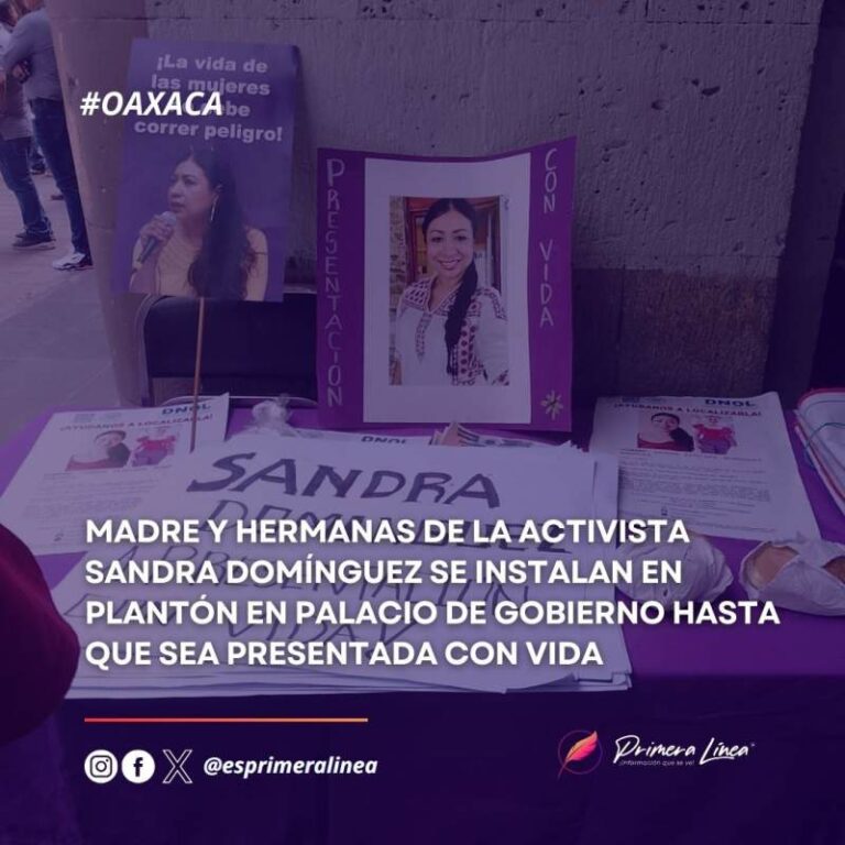 Madre y hermanas de la activista Sandra Domínguez se instalan en plantón en palacio de gobierno hasta que sea presentada con vida La madre y hermanas de Sandra Domínguez Martínez iniciaron un plantón en el corredor del palacio de gobierno en la… 6 noviembre, 2024