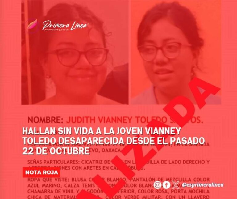 Hallan sin vida a la joven Vianney Toledo desaparecida desde el pasado 22 de octubre La joven de 29 años de edad Judith Vianney Toledo Santos fue encontrada sin vida en un domicilio ubicado sobre… 3 noviembre, 2024