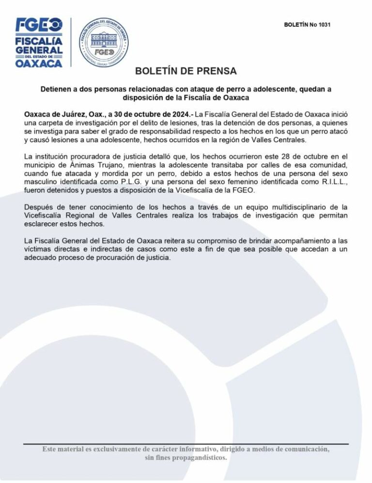 Detienen a dos personas relacionadas con ataque de perro a adolescente, quedan a disposición de la Fiscalía de Oaxaca Después de tener conocimiento de los hechos a través de un equipo multidisciplinario de la Vicefiscalía Regional de Valles Centrales… 30 octubre, 2024