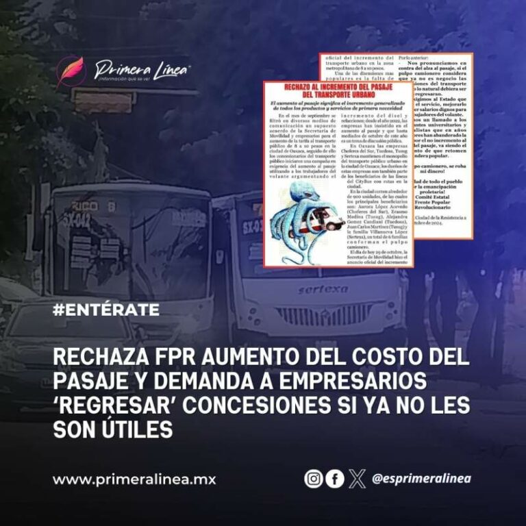 Rechaza FPR aumento del costo del pasaje y demanda a empresarios ‘regresar’ concesiones si ya no les son útiles El Frente Popular Revolucionario (FPR) rechazó el aumento de 25 por ciento en la tarifa del transporte urbano de la… 29 octubre, 2024