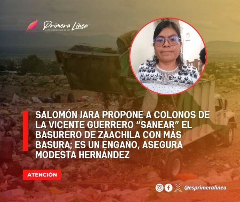 Salomón Jara propone a colonos de la Vicente Guerrero “sanear” el basurero de Zaachila con más basura; es un engaño, asegura Modesta Hernández El gobierno de Salomón Jara Cruz, a través de la Secretaría del Medio Ambiente, Biodiversidad, Energías y Sostenibilidad (Semabieso), ha… 30 octubre, 2024