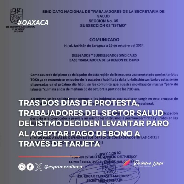 Tras dos días de protesta, trabajadores del sector salud del Istmo deciden levantar paro al aceptar pago de bono a través de tarjeta La Subsección 02 de la Sección 35 del Sindicato Nacional de Trabajadores de la Secretaría de Salud (SNTSA) determinó este… 29 octubre, 2024