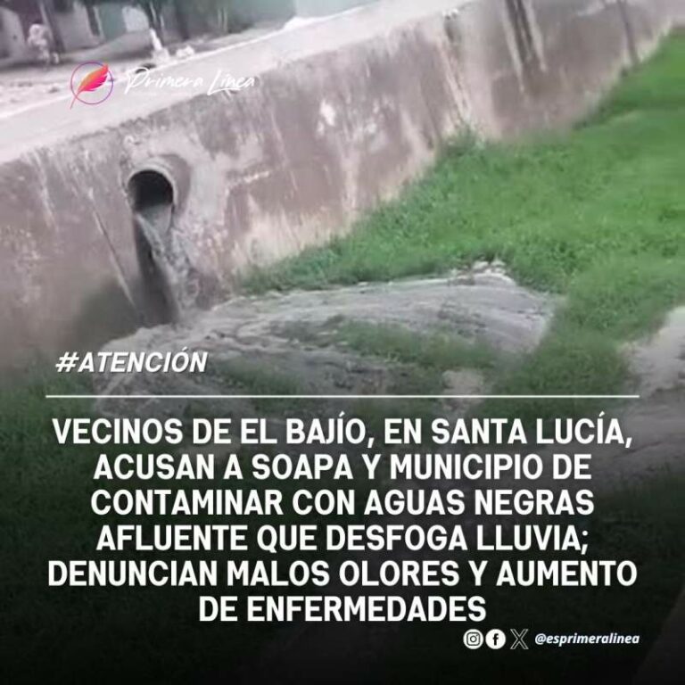 Vecinos de El Bajío, en Santa Lucía, acusan a Soapa y municipio de contaminar con aguas negras afluente que desfoga lluvia; denuncian malos olores y aumento de enfermedades Entre quejas por malos olores y la proliferación de casos de dengue y enfermedades gastrointestinales, vecinos de la colonia El… 23 octubre, 2024