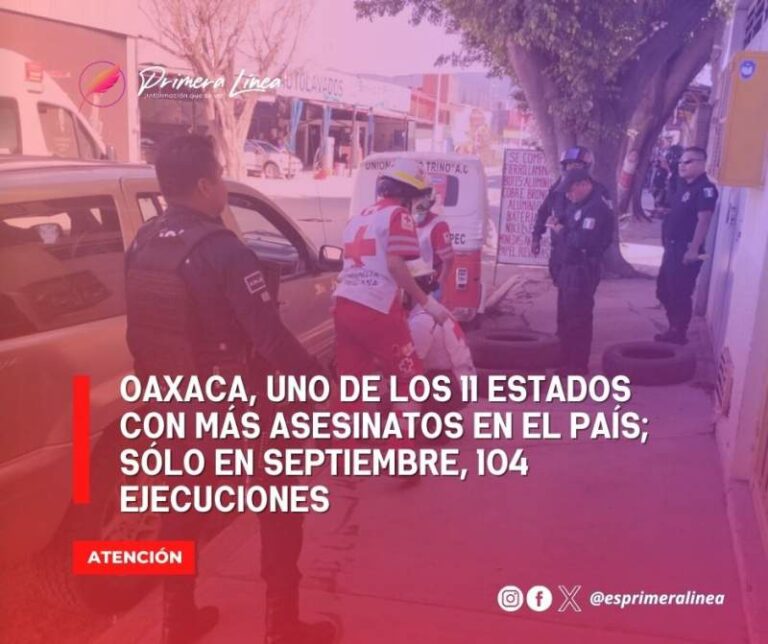 Oaxaca, uno de los 11 estados con más asesinatos en el país; sólo en septiembre, 104 ejecuciones El fenómeno de violencia continúa al alza en Oaxaca y en septiembre pasado llegó a 104 personas asesinadas en 30… 22 octubre, 2024