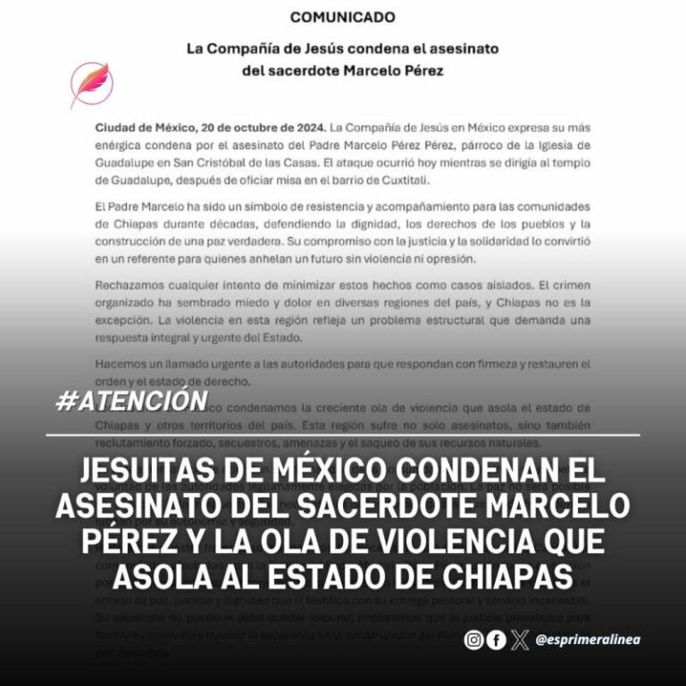 Jesuitas de México condenan el asesinato del sacerdote Marcelo Pérez y la ola de violencia que asola al estado de Chiapas La Compañía de Jesús en México condenó el asesinato del sacerdote Marcelo Pérez Pérez, párroco de la Iglesia de Guadalupe… 20 octubre, 2024