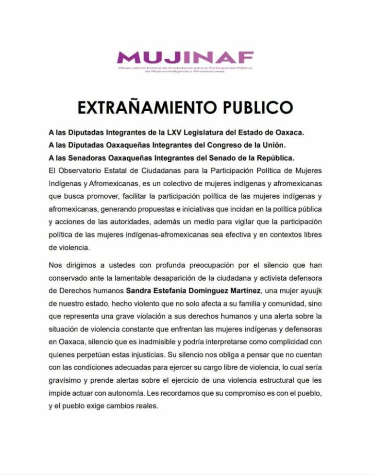 Condenan silencio de diputadas y senadoras oaxaqueñas ante desaparición de la activista Sandra Domínguez El Observatorio Estatal de Ciudadanas para la Participación Política de Mujeres Indígenas y Afromexicanas, condenó el silencio de las diputadas… 11 octubre, 2024