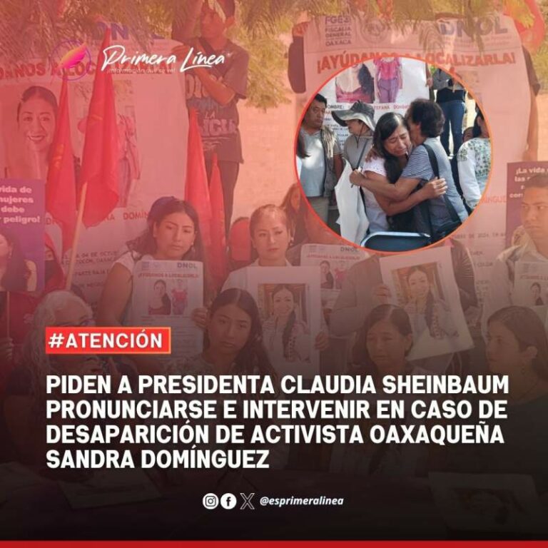 Piden a presidenta Claudia Sheinbaum pronunciarse e intervenir en caso de desaparición de activista oaxaqueña Sandra Domínguez A una semana de su desaparición, familiares, amigos y activistas de Oaxaca demandaron esta mañana la intervención de la presidenta… 11 octubre, 2024