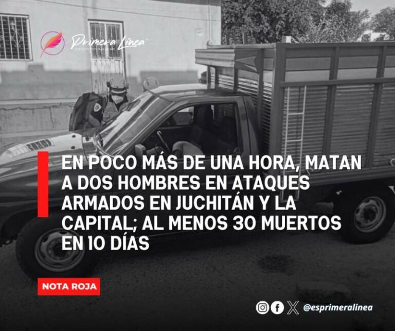 En poco más de una hora, matan a dos hombres en ataques armados en Juchitán y la capital; al menos 30 muertos en 10 días Al menos 30 personas fueron asesinadas en Oaxaca entre el primero y la tarde de este jueves 10 de octubre,… 10 octubre, 2024