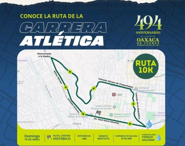 Este domingo habrá cortes viales por carrera atlética del 494 aniversario de la Ciudad de Oaxaca Con motivo del 494 aniversario de la fundación de Oaxaca, este domingo se realizará una carrera atlética conmemorativa que implicará… 19 abril, 2026