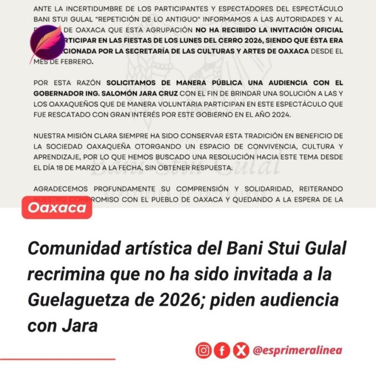 Comunidad artística del Bani Stui Gulal recrimina que no ha sido invitada a la Guelaguetza de 2026; piden audiencia con Jara La comunidad artística del espectáculo Bani Stui Gulal denunció que no ha sido invitada a participar en la Guelaguetza 2026,… 18 abril, 2026